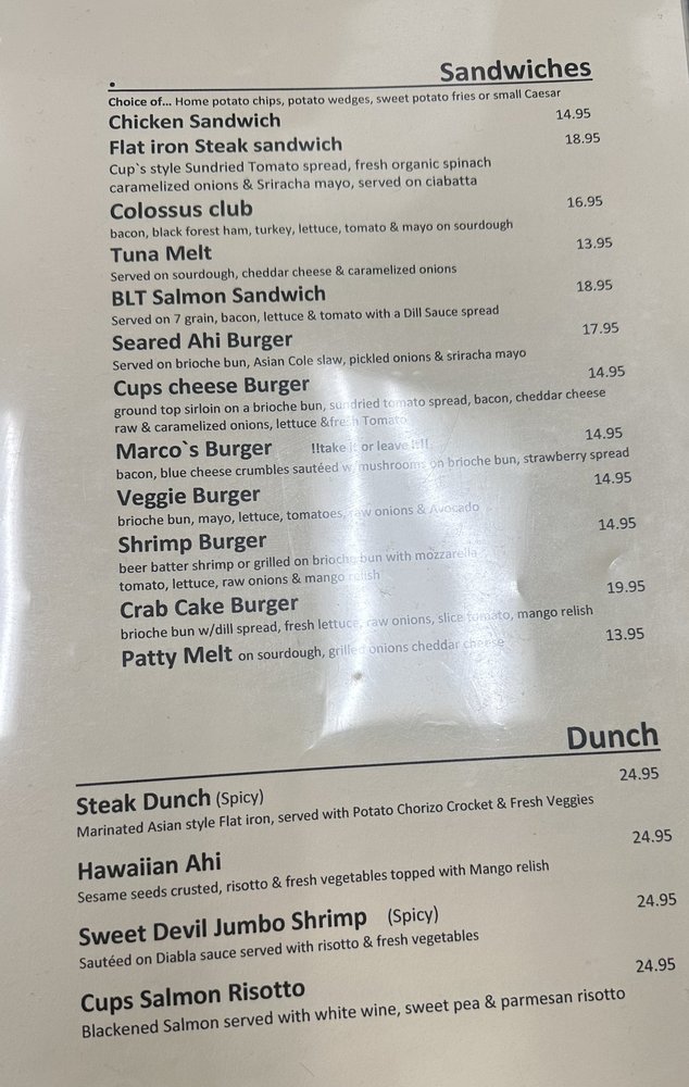 Cups Cafe in Palm Desert, CA offers a trendy and casual dining experience with a Latinx-owned touch. This breakfast and brunch spot provides a wide range of options, including vegan and vegetarian choices, making it suitable for various dietary preferences. The café features outdoor seating, wheelchair accessibility, and even a drive-thru for convenient service. Customers praise the efficient and friendly staff, with rave reviews about the delicious food and generous portions. Standout menu items include the ranchero omelette, cinnamon swirl French toast, lobster Benedict, and shrimp frittata. The cozy ambiance, quick service, and sumptuous dishes make Cups Cafe a must-visit for those craving a memorable dining experience.